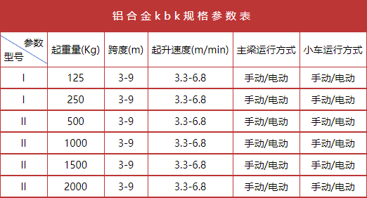 kbk铝合金起重机采用铝合金材质制成,不掉无污染,耐腐蚀抗氧化,使用寿命长,且自重轻,携带和安装都很方便。
