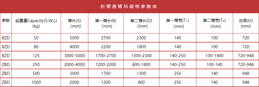 折臂式悬臂起重机又称折臂吊、曲臂吊。折臂式悬臂吊具有结构新颖、伸屈自如、操作灵便、高效节能的特点。操作时,按动电钮将载重物吊起,利用横梁的弯曲和旋转运动,在控制工作区域内避让物体,使工作区域zui大化。