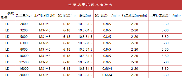电动单梁起重机适用起重量1T、2T、3T、5T、10T、16T、20吨,跨度 7.5M- 28.5米,起升高度有6M、9M、12M等。可根据用户实际使用需要非标设计或专业定做定制。