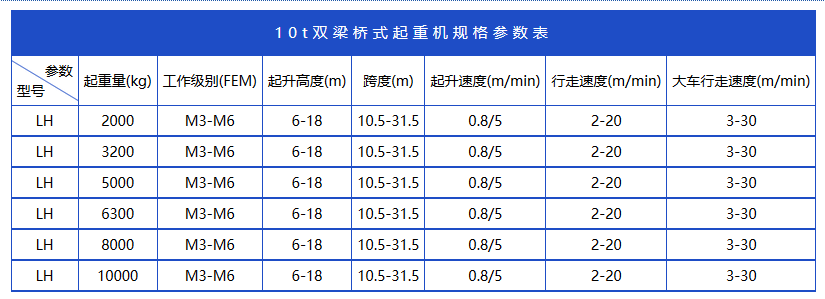 10t双梁桥式行车的桥架沿铺设在两侧高架上的轨道纵向运行,起重小车沿铺设在桥架上的轨道横向运行,构成一矩形的工作范围,就可以充分利用桥架下面的空间吊运物料,不受地面设备的阻碍。