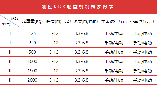 KBK起重机意为组合式起重机。刚性KBK起重机主要由轨道、悬挂装置、行走小车和一些功能组件构成,所有模块都为标准组件。起升装置主要采用环链电动葫芦,也可吊挂一些机械手或焊枪之类,作为工具滑轨使用。起重量一般为125kg-2000kg,适应范围极广,尤其适用于现代化生产输送线、轻工业流水线、物料搬运现场等场地。